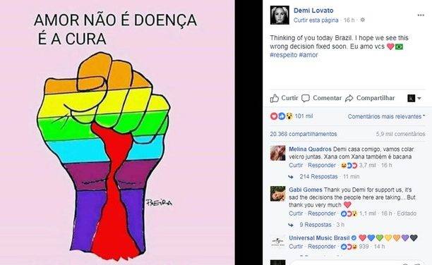 Demi Lovato fez uma postagem em sua página do Facebook criticando a decisão da Justiça Federal do Distrito Federal de permitir que gays e lésbicas sejam tratados como doentes por psicólogos. Ela compartilhou a imagem que vem circulando na internet nos últimos dias, com um punho fechado, nas cores do arco-íris, e as frases “amor não é doença, é cura” e “trate seu preconceito”. Na descrição do post, Demi escreveu “Pensando em você hoje, Brasil. Eu espero que vejamos essa decisão errada consertada em breve. Eu amo vocês”.